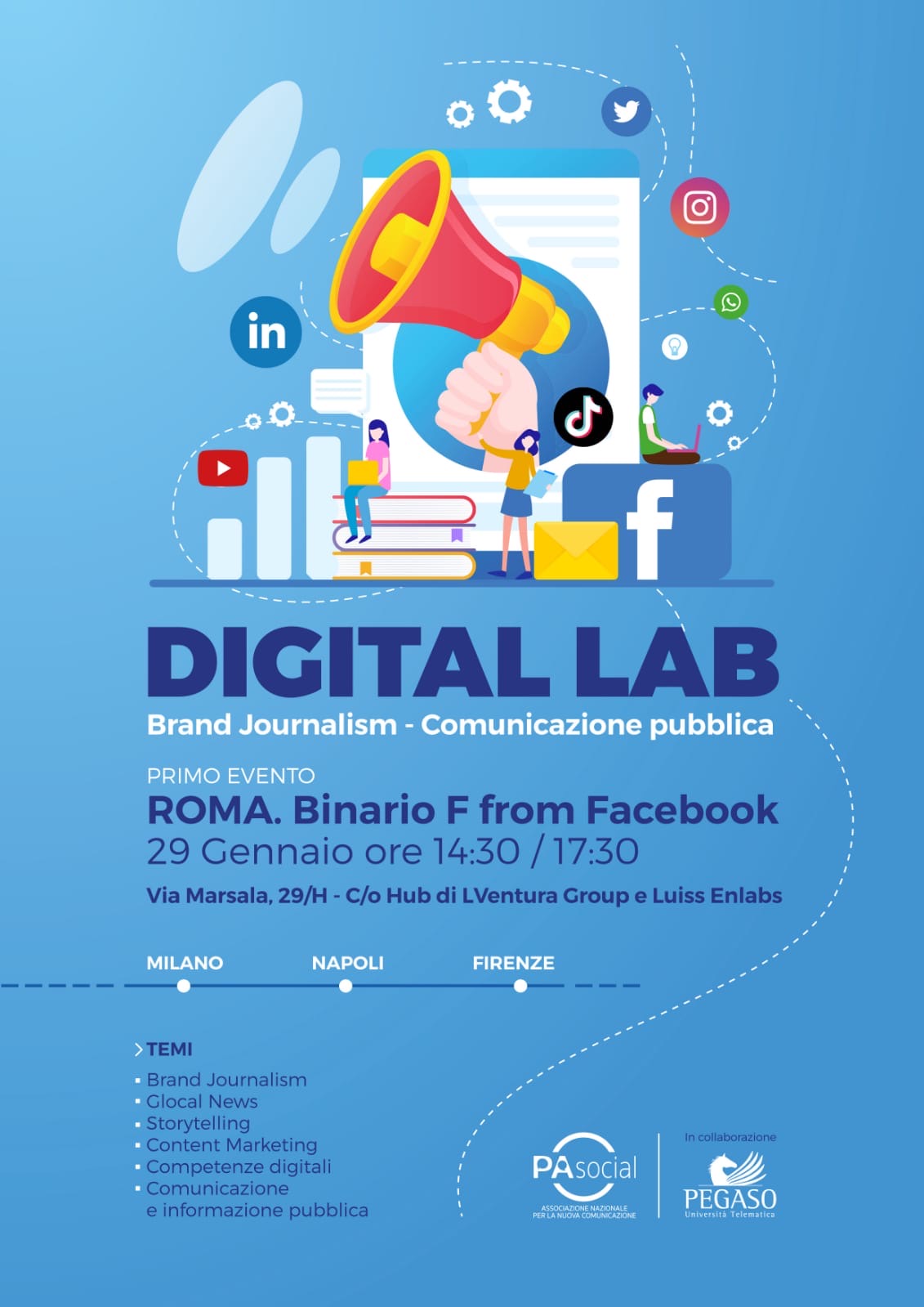 Nasce il Digital Lab – Brand Journalism e Comunicazione pubblica. Un nuovo percorso di formazione e divulgazione, ideato dall’Associazione PA Social in collaborazione con Università Pegaso, coordinato da Roberto Zarriello. Il Digital Lab si occupa di approfondire temi come brand journalism, glocal news, storytelling, content marketing, competenze digitali, comunicazione e informazione pubblica, con la partecipazione di docenti, giornalisti, comunicatori, social media manager, esperti di comunicazione, informazione, digitale. Gli appuntamenti (gratuiti e aperti a tutti con iscrizione):